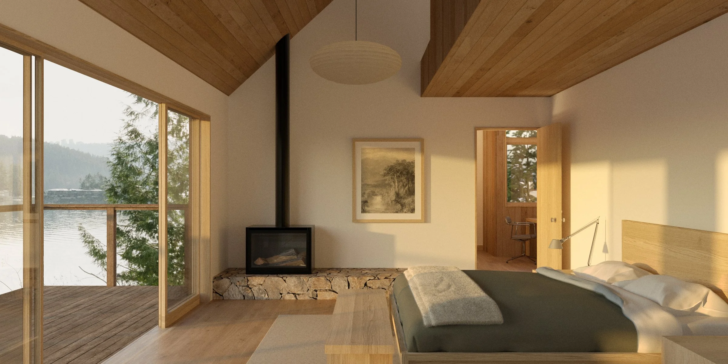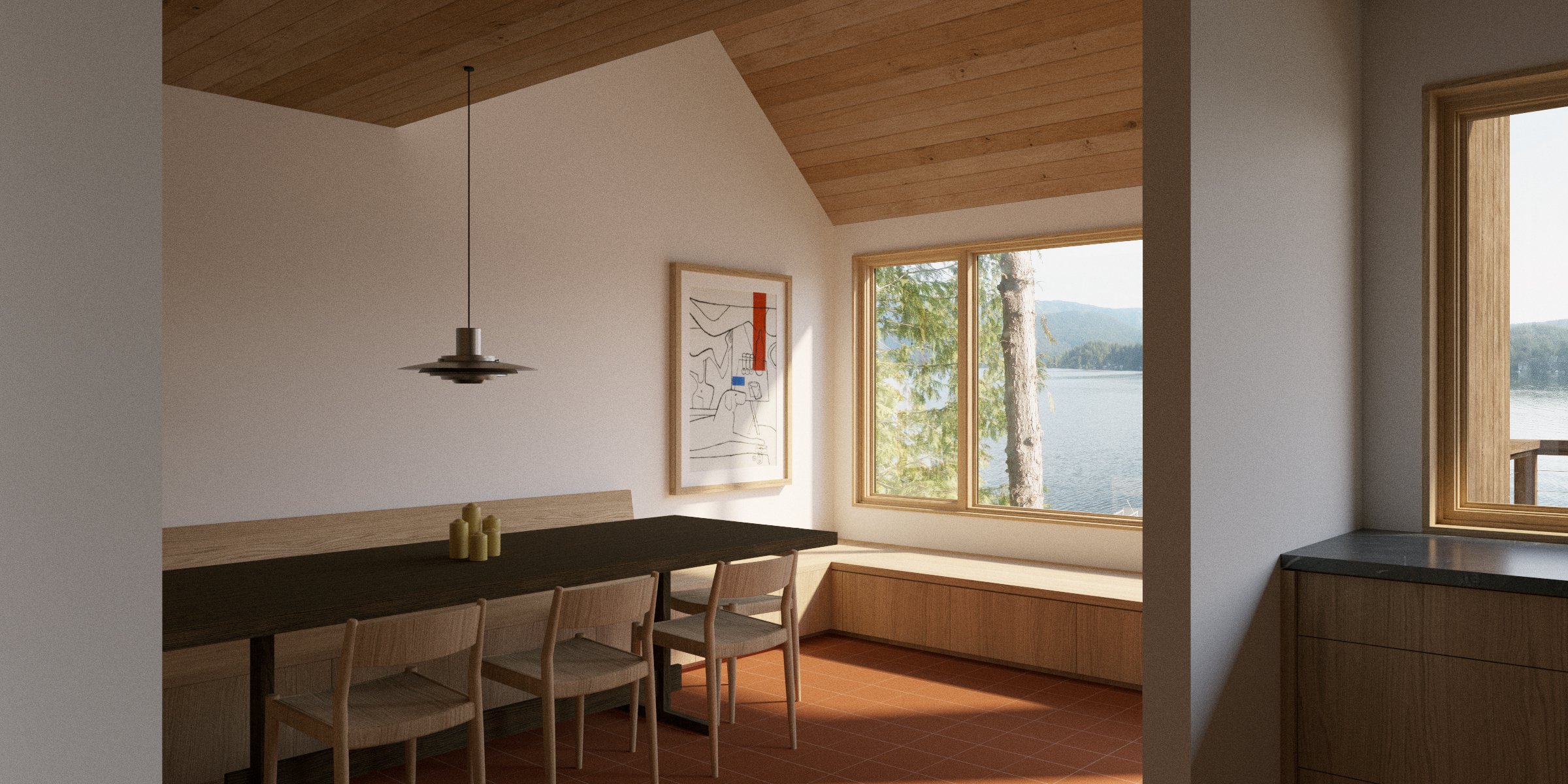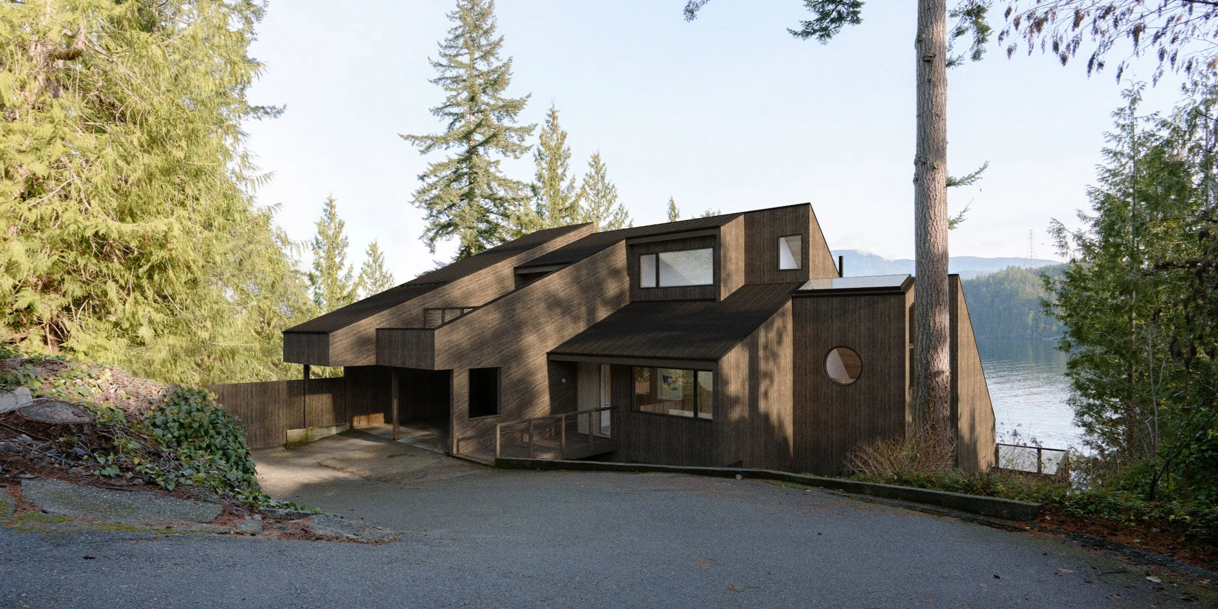 The project is a renovation of a house built in 1977 in Deep Cove, North Vancouver, on a steeply sloping waterfront lot. A split-level plan was originally designed to accommodate a family, with typical room sizes for the time, within a modernist structure with vaulted interior spaces beneath sloping roofs and views towards the ocean and mountains.