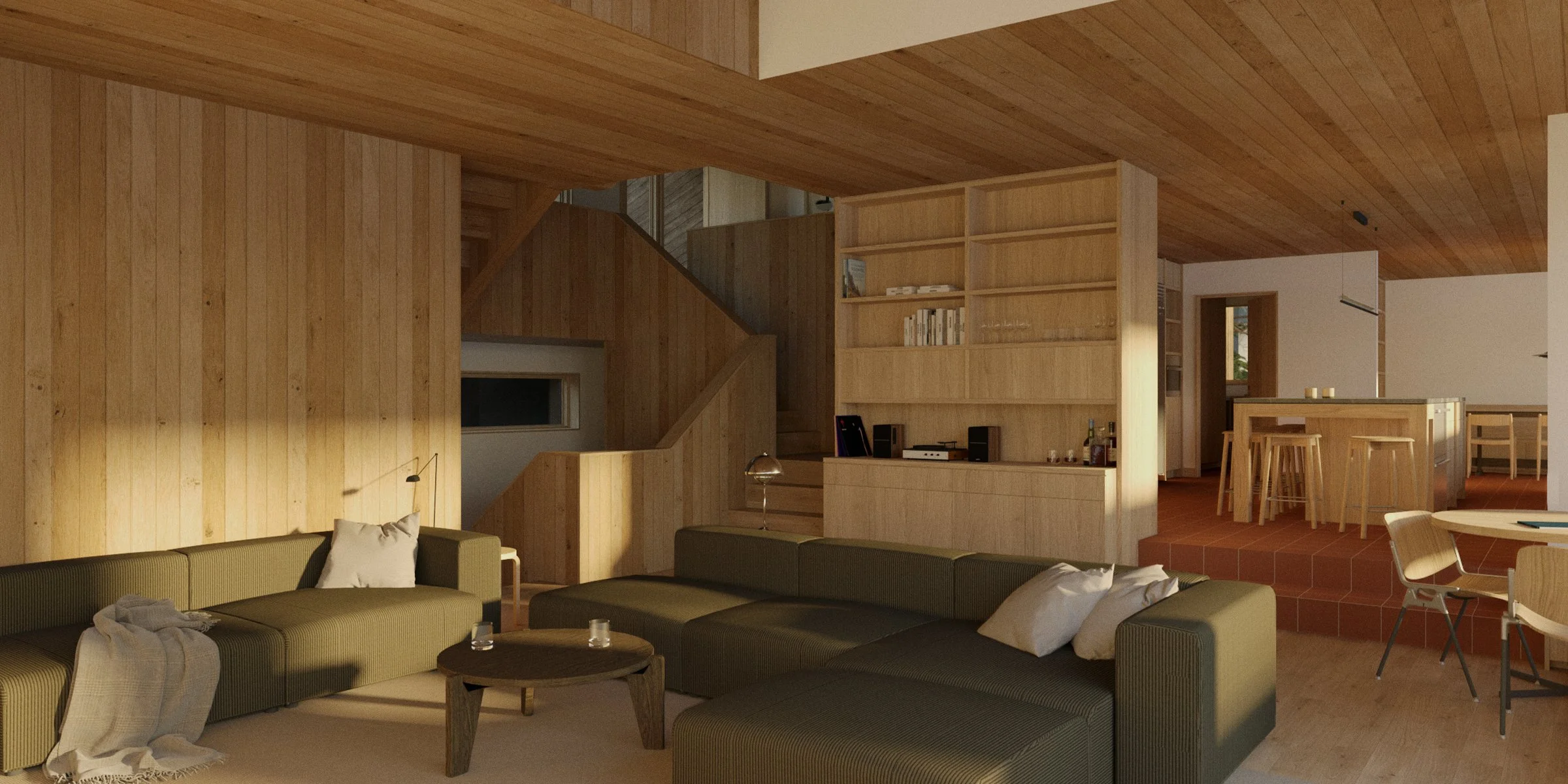 The major change consists of an entirely new vertical circulation path that connects all levels with one spiraling staircase introduced to provide a clear direction for movement. The previous bedrooms, all democratic in size and grouped together on the upper levels, were replaced with private primary suite and office, while new secondary bedrooms and a multipurpose rec room/study area for kids were relocated to the previously underutilized lower level. The original cramped living level has also been reconfigured to provide a more functional layout, creating a central gathering space that frames the unobstructed ocean and mountain views.